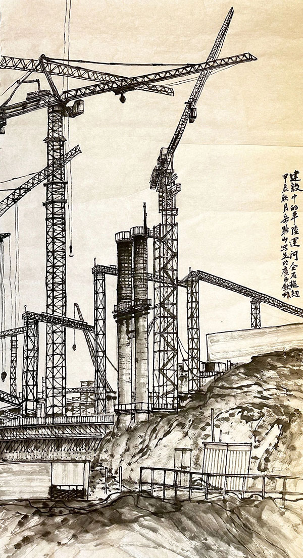 气势磅礴的施工现场,工程机械的轰鸣声交织成一曲雄浑的乐章,数不清的塔吊纵横交错,有如钢铁森林,各类建筑设施与工人们忙碌的身影共同勾勒出一幅波澜壮阔的建设画卷。这一切繁忙的建设场景和工人们辛勤的劳动,都转化为艺术家们的灵感,他们挥毫泼墨,把内心的震撼与激动凝练为一幅幅精品佳作。