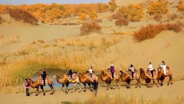 深秋时节,新疆南部胡杨林层林尽染,在尉犁县塔塔秘境罗布湖旅游度假区内,点缀在大漠中的金色胡杨吸引众多游客观赏。
