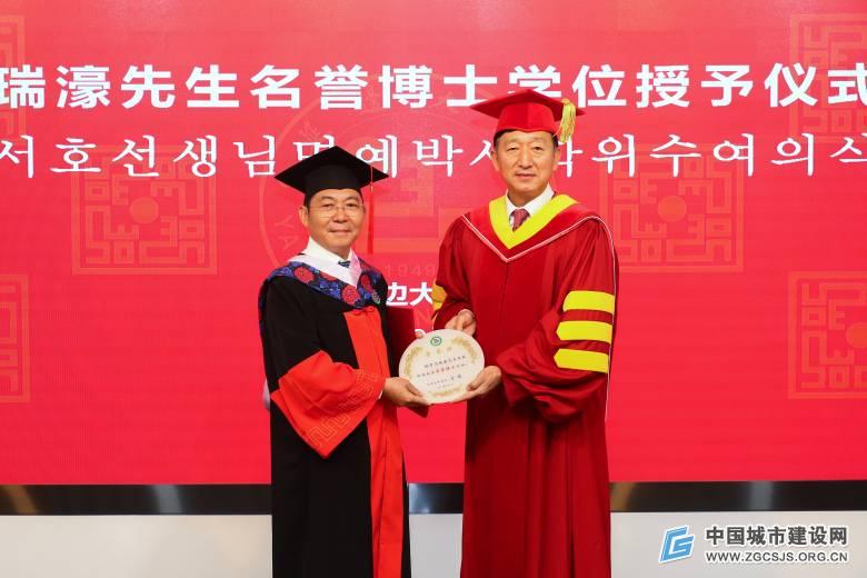 9月1日上午,根据国务院学位委员会学位[2022]1号文件通知精神,延边大学党政领导、教职员工、同学校友共同为马瑞濠举行了一场别开生面的名誉博士学位授予仪式。延边大学校长金雄为马瑞濠颁发了名誉博士学位证书、扶正流苏并赠送荣誉牌。