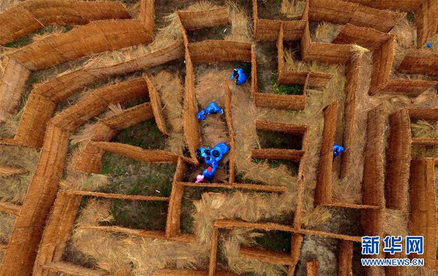 10月30日,游客在湖北省宣恩县贡水河湿地公园体验“稻草迷宫”。日前,一座“稻草迷宫”在湖北省恩施土家族苗族自治州宣恩县贡水河国家湿地公园建成开放,吸引不少游客前往体验游玩。 新华社发(宋文 摄)