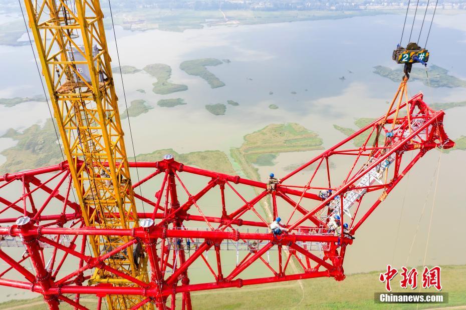 9月4日,在安徽省阜阳市颍上县润河镇,安徽送变电工程有限公司施工人员在270多米高空中安装500千伏淮河大跨越工程北岸跨越塔横担。 当日,历经施工人员66天的建设,由安徽送变电工程有限公司承建的六安市石店变电站至阜阳市500千伏输变电工程淮河大跨越北岸跨越塔成功封顶。该工程属安徽省“十三五”重大能源项目,淮河大跨越由两座跨越塔、四座锚塔组成,为目前淮河边最高的输电通道铁塔,整个工程计划在2020年1月底实现全线贯通。图为9月4日,在安徽省阜阳市颍上县润河镇,500千伏淮河大跨越工程北岸跨越塔横担在275米高空中成功就位。 中新社发 郑贤列 摄 图片来源:Cnsphoto