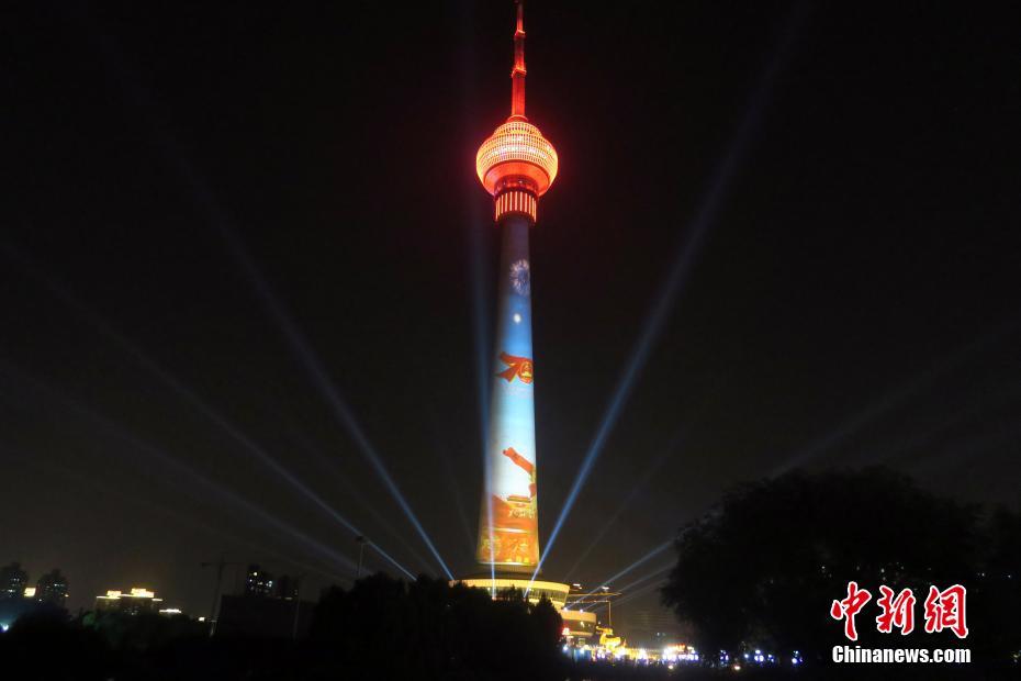 9月28日晚,位于北京西三环外的中央电视塔上演国庆主题灯光秀,塔身循环展示70年来中国科技发展、经济建设等取得重大成就的画面,以此迎接即将到来的国庆节。中新社记者 孙自法 摄