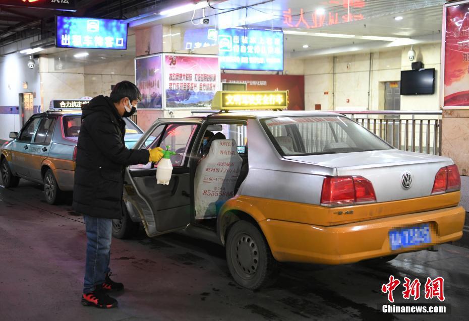 2月17日,工作人员为出租车消毒。长春市交通运输局组织长春市出租汽车行业协会和长春市53户出租汽车企业,在长春市设置25个出租汽车免费消毒点,实现全市区域内全覆盖,保证出租汽车日常营运消毒需求。中新社记者 张瑶 摄