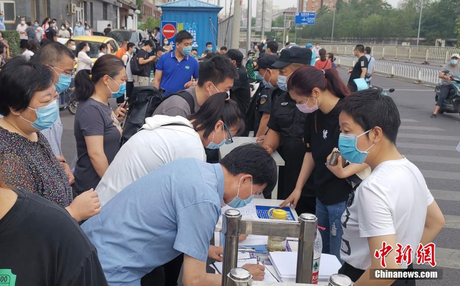6月16日,北京西城疫情防控工作领导小组贴出通知,自6月16日凌晨2:00起,西城区对广外天陶红莲菜市场周边7个社区实施封闭式管理。社区封闭期间,将进一步加强群防群控工作,严格落实社区疫情防控各项措施,实行24小时专人值守,严控人员出入。6月14日,西城区广外天陶红莲菜市场有一名往来新发地市场人员被确诊为新冠肺炎病例。图为社区工作人员登记进出人员信息。 中新社记者 杜洋 摄
