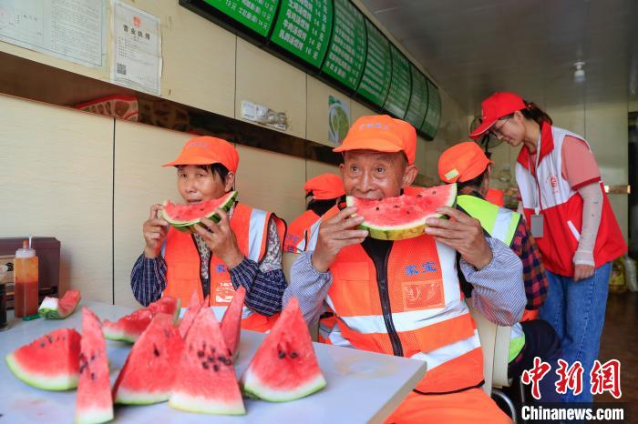 8月3日,在安徽省合肥市庐阳区林店街道官塘社区设立的一处爱心“清凉驿站”内,社区志愿者正在为一线环卫工人免费提供饮用水、西瓜、人丹等防暑降温物品。近日,合肥平均气温均在36度以上,为保障辖区一线环卫工人安全作业,社区在辖区沿街商铺开设多个爱心“清凉驿站”,让环卫工们在工作间隙有个清凉的休息环境。(张俊 赵明 史翠云)