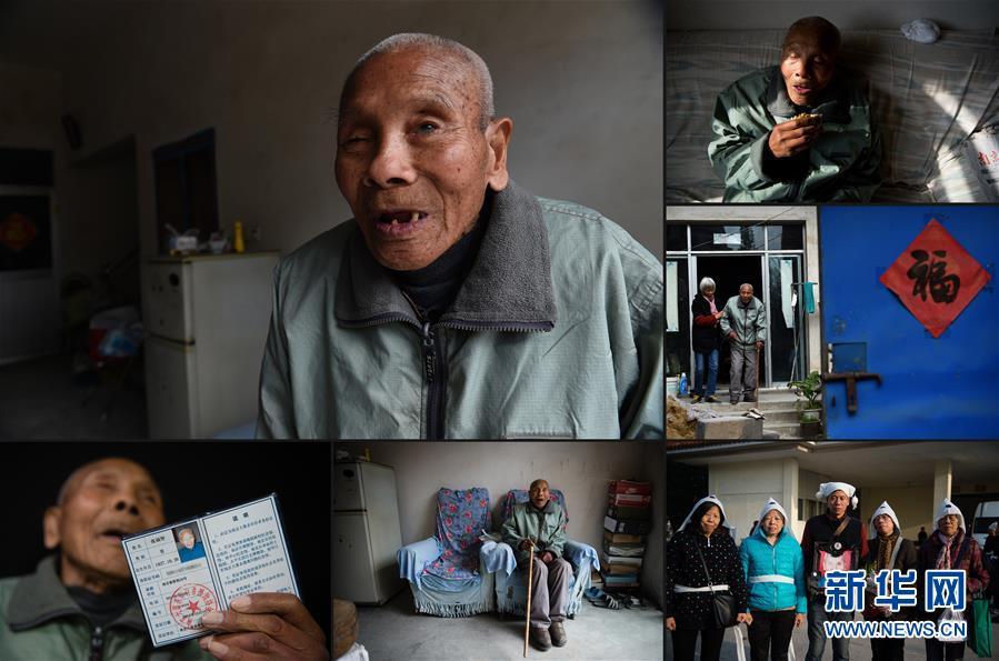 易翠兰,1923年5月6日生于南京老城南。1937年冬,易翠兰被家人在脸上涂满锅灰装扮成男孩,辗转在五台山难民区和金陵女子大学难民收容所避难。虽然最终从血泊中死里逃生,但她因遭日军用枪托殴打,落下终身病根,经常疼痛难忍。易翠兰在南京临时租住处门前(2016年11月25日摄)(左上);易翠兰展示自己的南京大屠杀幸存者证书(2016年11月25日摄)(左下);易翠兰在南京临时租住的家中(2016年11月25日摄)(右上);易翠兰儿子陶盛福在帮助老人穿戴衣物(2016年11月25日摄)(右中);易翠兰经常依靠制氧机缓解呼吸困难的病症(2016年11月25日摄)(右下)。
