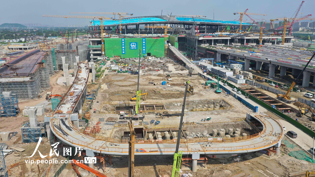 作为2022年杭州亚运会的重点交通保障工程,杭州西站枢纽总建筑面积约51万平方米,是我国大型铁路枢纽之一,采用站城融合一体化设计。目前,站房屋面闭水工程即将完成,枢纽标志性建筑“云门”已开工建设,雨棚上盖开发项目、杭州西动车所盖板项目等工程有序推进。谢尚国摄(人民图片网)