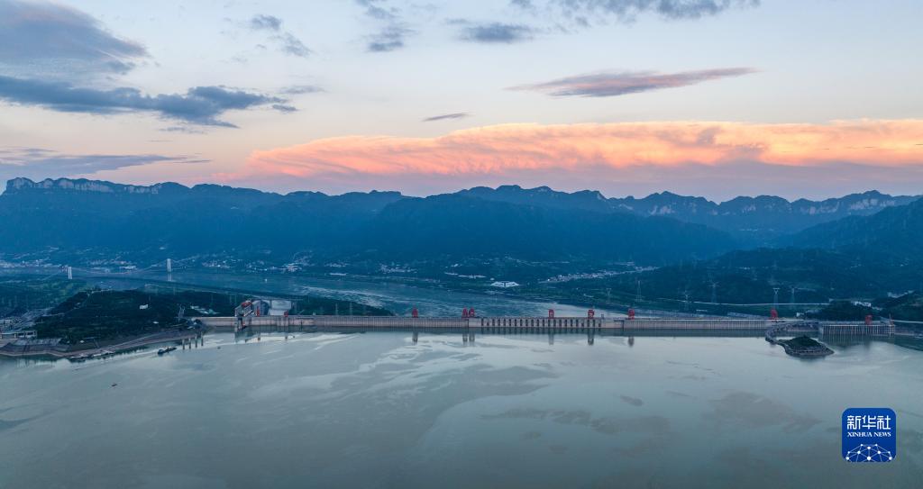 这是7月9日在湖北省宜昌市拍摄的夕阳映照下的三峡水利枢纽工程(无人机照片)。