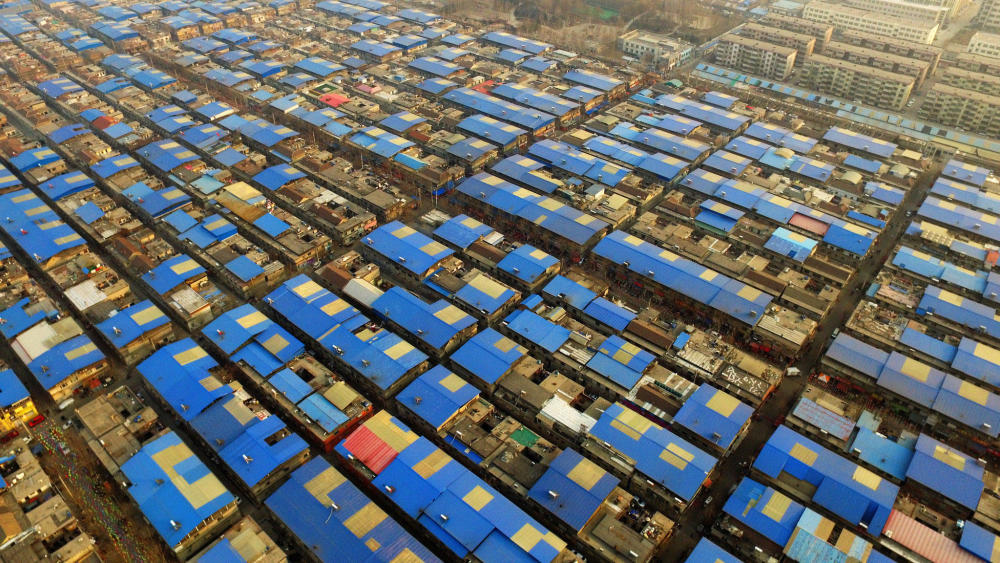 2017年2月13日,山东济南,航拍即将消失的城市中的“城中村”,密密麻麻的彩色蓝屋顶如同像素块一般,俯瞰场面十分壮观。(东方IC)