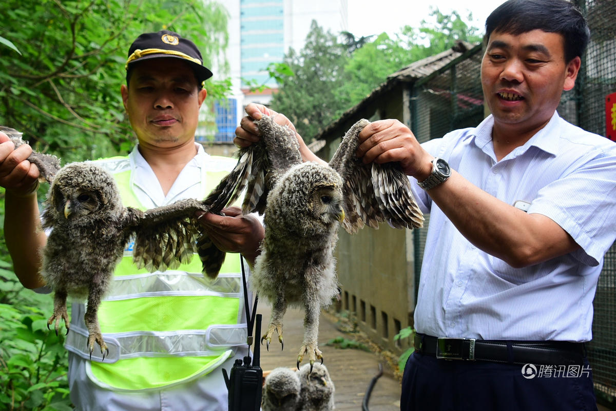 5月15日,郑州,市民张先生将在路边捡到的几只雏鸟送到了野生动物救护站,经工作人员辨认,它们是雕鸮的幼雏,是国家二级重点保护动物,疑有人非法贩运担心被查,丢弃路边。视觉中国