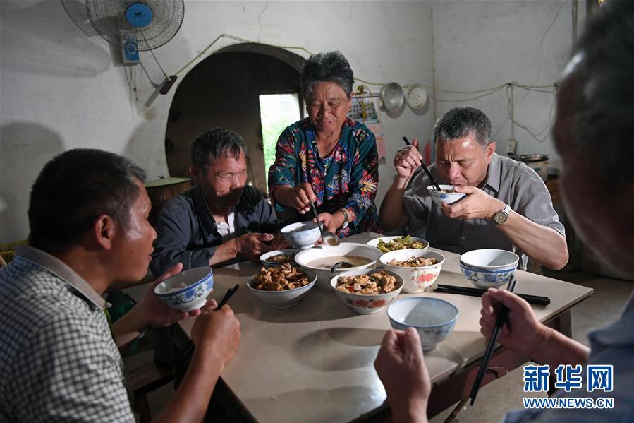 “几个老伙计都60多了,学道情,收入低,太辛苦。”谈起曲艺队的未来,培养新人已成为陈锁生最关心的事。图为盲人曲艺队在上高县徐家渡镇万坑村的村民家里吃“派饭”(5月18日摄)。