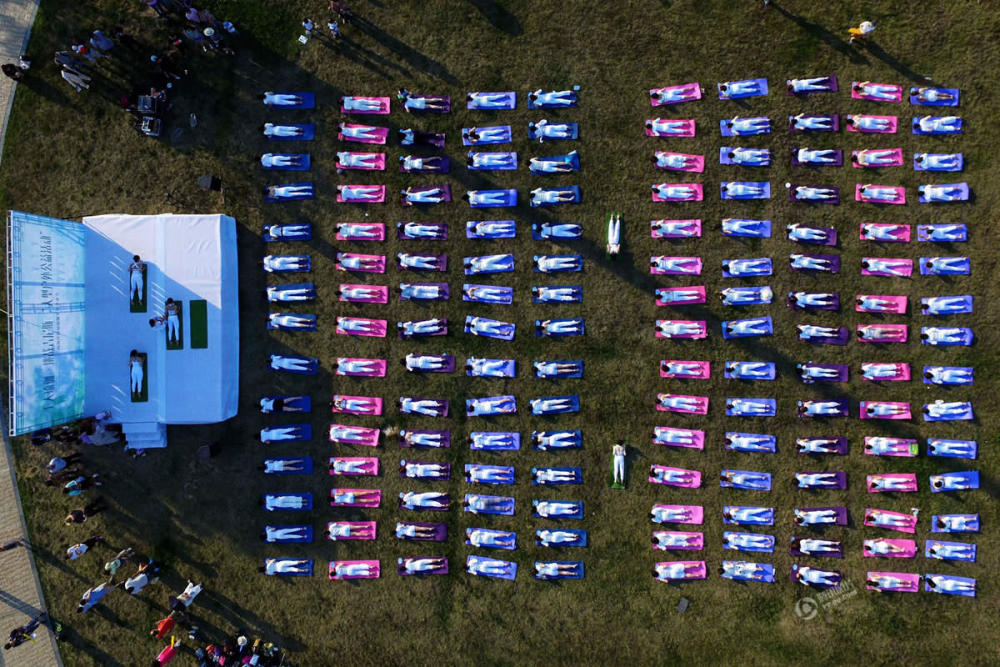 6月19日,在“国际瑜伽日”到来之际,100余名瑜伽爱好者在河南省滑县新区体育场练习瑜伽。 新华社发(王子瑞 摄)