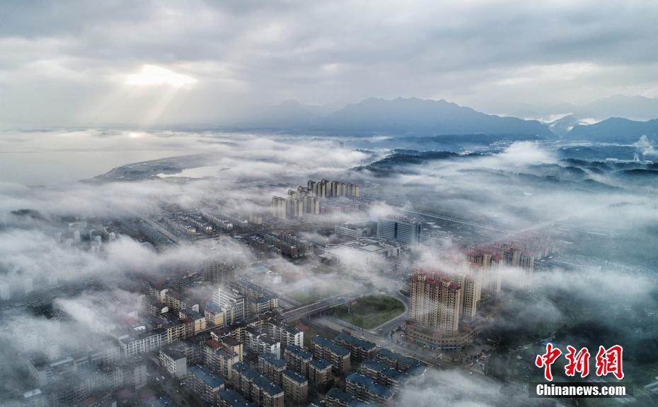 3月5日,航拍江西武宁县城一带惊现云雾奇观,仿佛置身天宫。在浓雾的笼罩下,武宁县城云雾缭绕,宛若“海市蜃楼”,美不胜收。罗鑫钢 摄