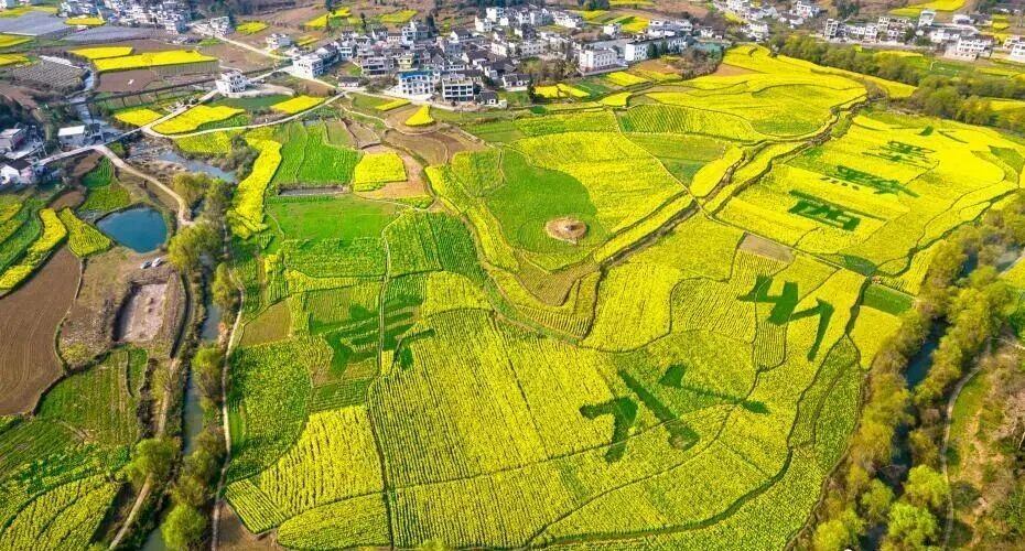 早春时节,贵州多地油菜花迎春绽放,金黄色的油菜花海与民居、小溪、道路相映成景。图为航拍贵州省黔西市洪水镇的油菜花田。
