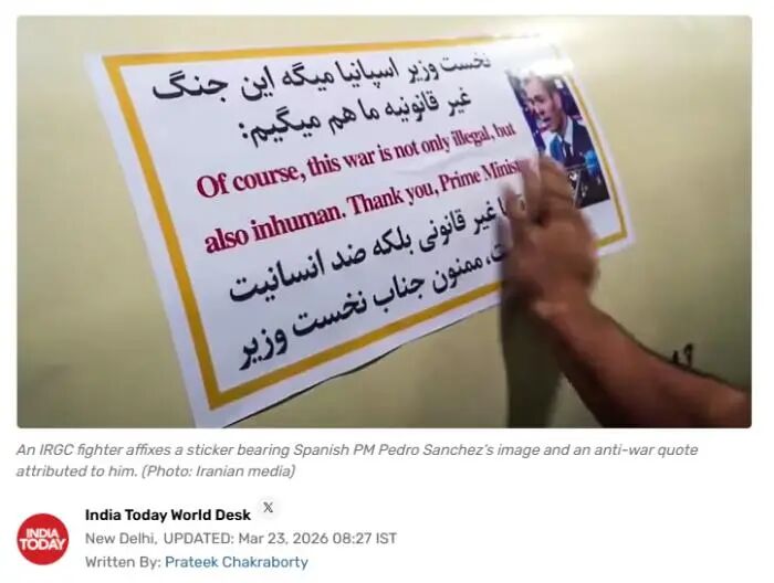 据《印度时报》、《今日印度》23日援引伊朗当地媒体报道,伊朗将西班牙首相桑切斯的言论以英语和波斯语两种语言写在贴纸上,并贴在从伊朗向以色列发射的导弹上。