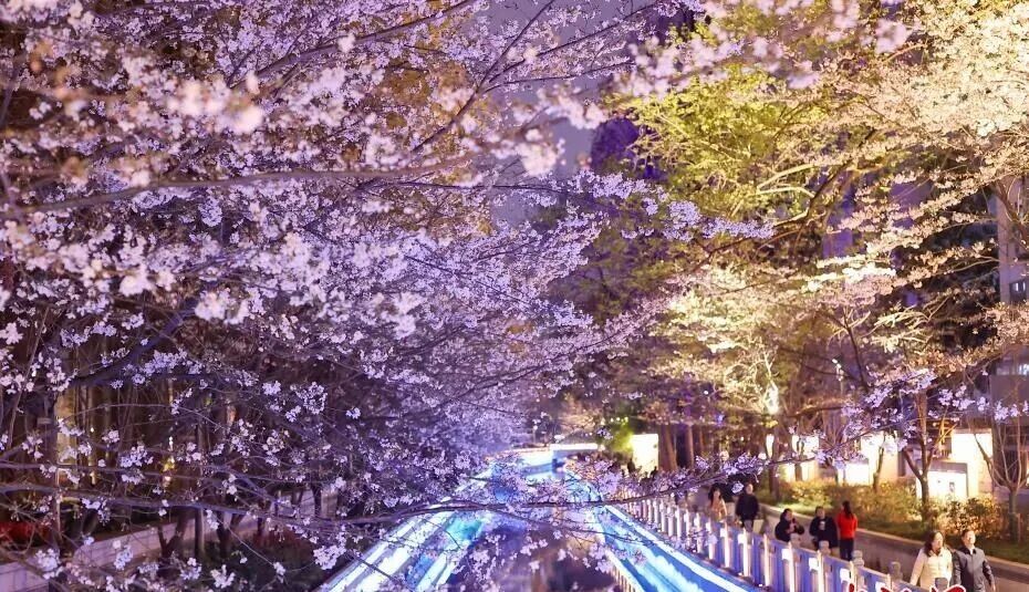 3月23日晚,江苏南京,太平北路珍珠河畔樱花盛开,成为夜色中的独特风景。