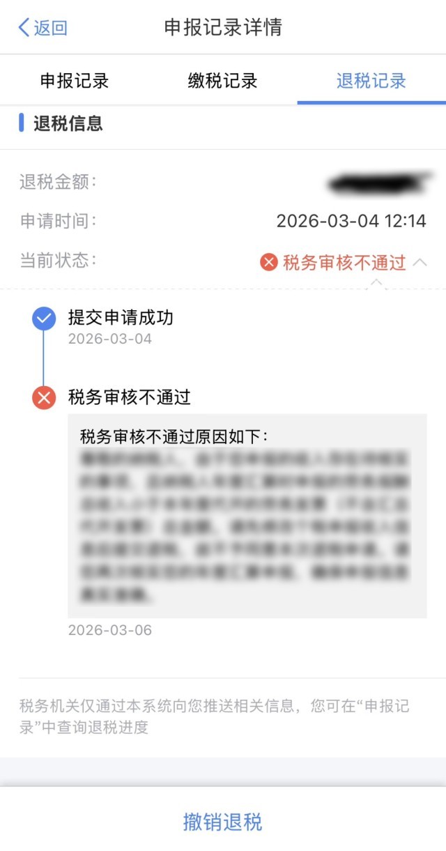 3月1日至6月30日,2025年度个人所得税综合所得汇算正在进行。纳税人在提交退税申请后,一般会遇到税务审核中、税务审核不通过、国库处理中、国库退库失败、国库处理完成5种不同情形,其中,需要重点关注的是税务审核不通过和国库退库失败两种情况。