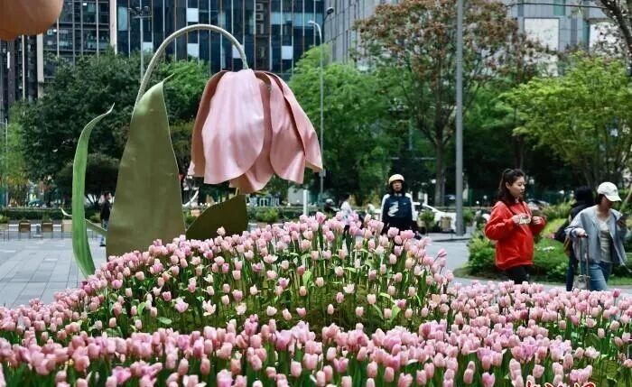 3月30日,四川成都一组名为“捧花见面”的巨型仿真花艺术装置吸引不少市民驻足欣赏、拍照留念。艺术装置以巨型仿真花束为主体造型,四周环绕仿真郁金香花海,地面搭配郁金香主题彩绘装饰,营造出浪漫的春日花境氛围。