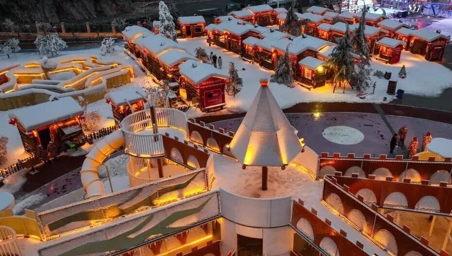 1月7日晚,游客在贵州省六盘水市钟山区“南国雪乡”项目内游玩。该项目由钟山区梅花山旅游景区凭借梅花山滑雪场的核心优势,以“厚雪压木屋、红灯映炊烟”为设计理念打造,旨在让南方游客无需北上即可邂逅地道雪乡风情,打造沉浸式文旅新体验。