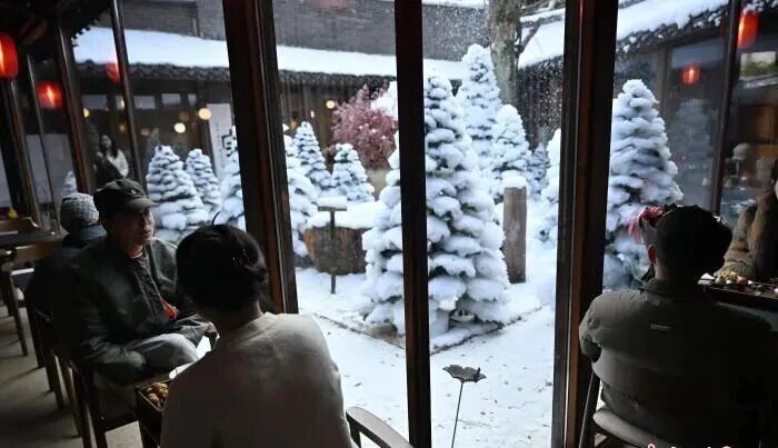 1月7日,四川成都一间茶馆内的“人造雪景”吸引市民打卡拍照。这处“人造雪景”是由造雪机用“雪花油”和纯净水制作而成,搭配松树景观,为成都街头增添冬日气氛。