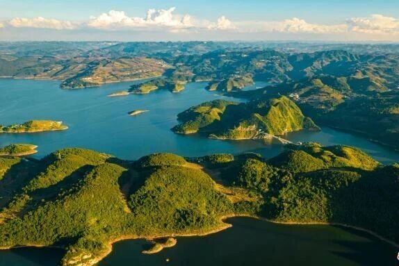 秋日里,贵州省毕节市境内的洪家渡水库,青山环抱,碧水如镜,一幅河畅、水清、岸绿、景美的生态画卷在乌蒙高原徐徐展开。近年来,毕节市坚持生态优先、绿色发展理念,大力推进乌江上游水资源保护,水污染防治,水生态修复,生态环境持续向好。图为航拍贵州省毕节市境内的洪家渡水库壮美如画。