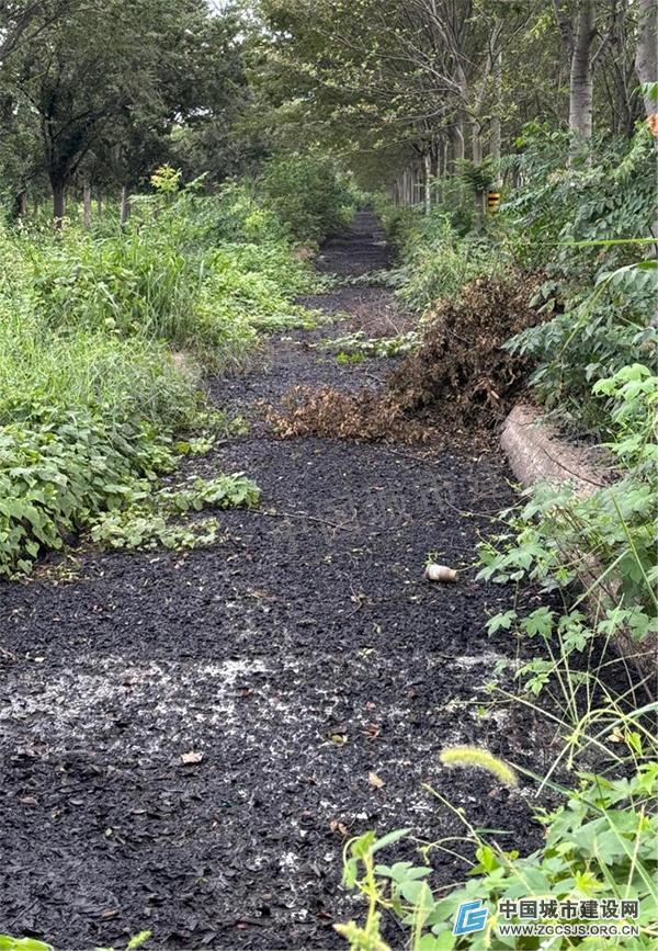 在村民的指引下,记者来到污染现场。刚停下车,远远便闻到令人窒息的恶臭。在田间地头的沟渠中满是黑色污染物,不断发酵产生气泡,还滋生了大量蝇虫。沿着沟渠行走数百米后,记者又在农田之间的道路上看到大量堆积的黑色污染物。