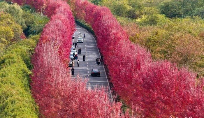 11月3日,江苏南京,大泉湖畔乡村公路两旁枫叶如霞似火,放眼望去,美景如画。