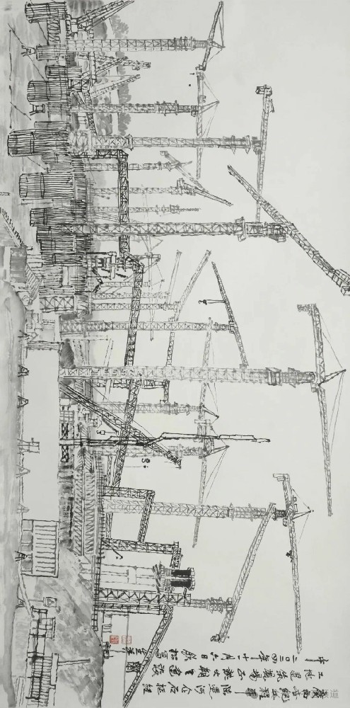 《平陆运河·马道枢纽工地现场写生》 50x100cm