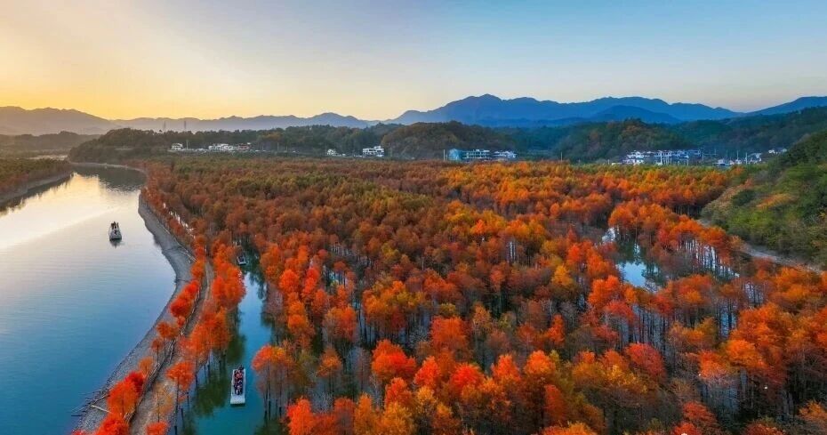 11月26日,安徽宣城,游客乘坐竹筏在宁国市方塘乡落羽杉湿地公园游览。初冬时节,位于安徽省宣城市宁国市方塘乡落羽杉湿地公园的2000余亩红杉林逐渐变红,吸引众多游客前来观光游玩,乐享冬日美好时光。