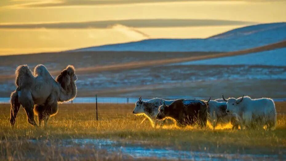 近日,内蒙古自治区锡林郭勒盟锡林浩特迎来入冬后的首场降雪。落日时分,余晖洒落,漫天雪花如碎金般飞舞,茫茫草原覆上一层薄白。骆驼群沉稳徜徉,牦牛群悠闲食草。夕阳中,它们的身影被镀上一层温暖金边。