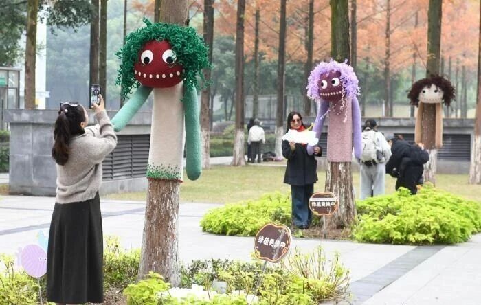 12月9日,重庆渝兴广场,一棵棵“穿”上卡通外衣的大树吸引市民前往打卡。据了解,大树的卡通外衣由羊毛毡、毛线、扭扭棒等材料编织而成,萌趣十足暖意浓。