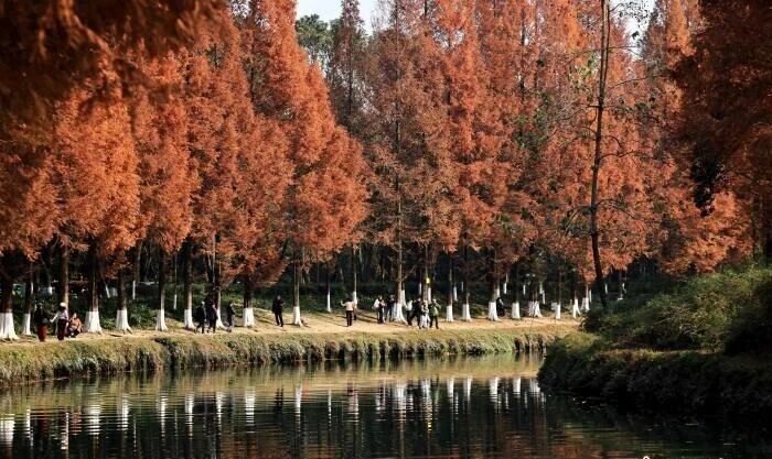 12月15日,游客在水杉树下拍照。当日,冬日暖阳下的四川省成都市升仙湖公园,尽染“红妆”的水杉林吸引游人打卡拍照。