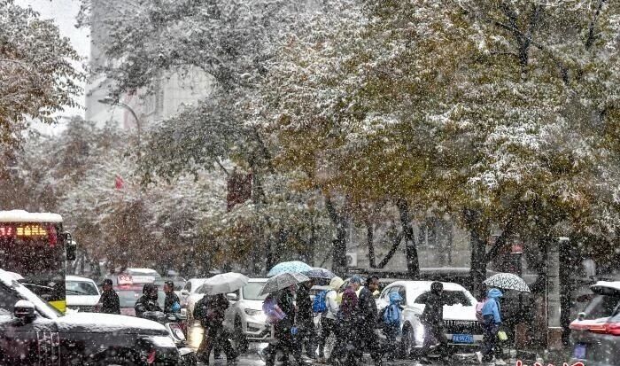 10月15日,新疆乌鲁木齐市降下皑皑白雪,学生在雨雪天气中出行。受冷空气影响,新疆伊犁河谷、塔城地区、阿勒泰地区、石河子市、乌鲁木齐市等多地迎来雨雪天气,气温普遍下降5至8摄氏度。