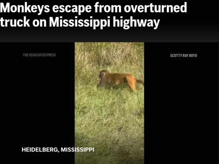 据美联社报道,当地时间28日,美国密西西比州一条高速公路上,一辆运送猴子的卡车发生侧翻,导致被运输的猴子逃脱。当地警方称,除一只猴子外,其余逃脱的猴子“均已被射杀”,并警告称这些猴子“具有攻击性”。但目前尚不清楚卡车上原本有多少只猴子。