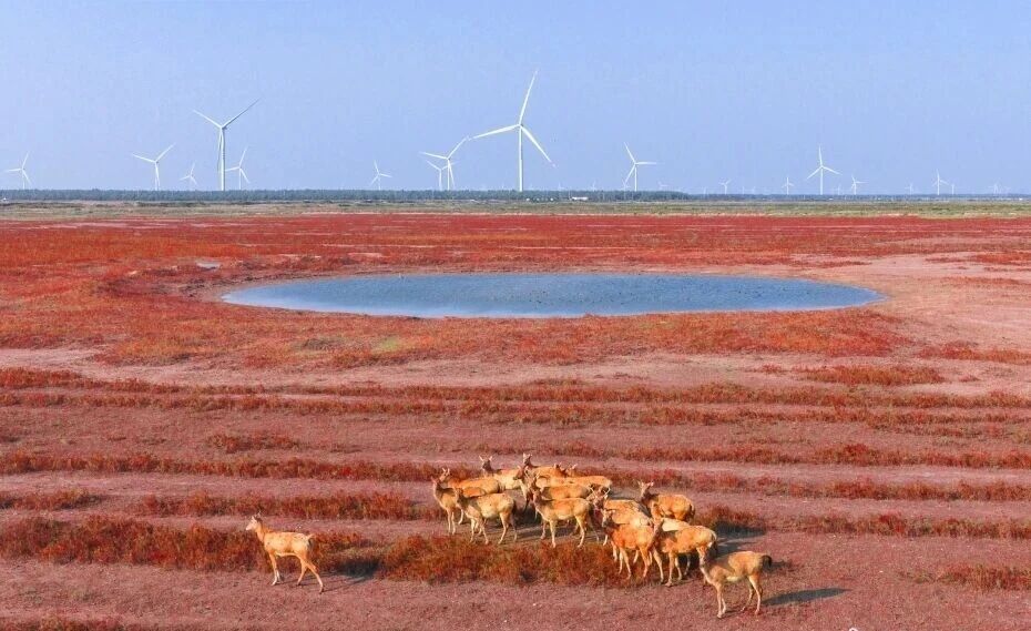 10月28日,江苏省盐城市东台条子泥湿地,碱蓬草铺就的“红地毯”绵延无际,一群麋鹿穿梭奔跑,湿地浅塘与远处风电设施相映成趣。