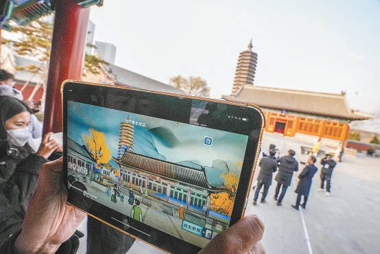 手机下载、打开指定软件,用摄像头扫描实景,游客就能“穿越”到明清时代的大运河畔——屏幕中的古建筑一下子变成了水墨风,荷花自桥下生长绽放,美不胜收,随着游客在景区里行走,屏幕里的数字人也会相应移动,到达学正署后,可以根据虚拟人物的引导,拼装虚拟农具;到达尊经阁,可以翻阅阁中书籍,获得“元宇宙”世界道具……该项目相关负责人表示,AR技术不仅为游客创造了一个未来科技感的互动体验世界,也为传统景区发展带来了新的活力和增长点。