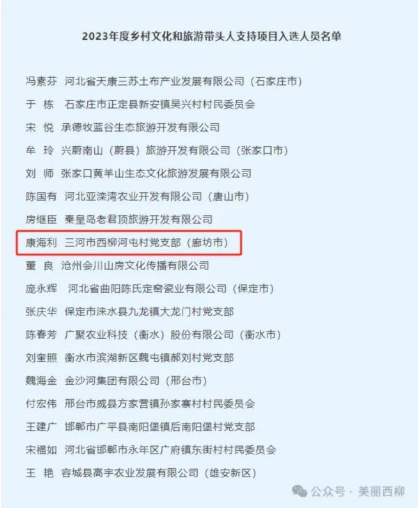 日前,中共河北省委农村工作领导小组办公室、河北省农业农村厅、中共河北省委宣传部、河北省民政厅、河北省司法厅五部门联合发布了第一批河北省乡村治理示范村镇名单,其中三河市燕郊镇西柳河屯村被评为第一批河北省乡村治理示范村。同时,文化和旅游部办公厅发布《关于印发2023年度乡村文化和旅游带头人支持项目入选人员和资助人员名单的通知》,公布了2023年度乡村文化和旅游带头人支持项目入选人员和资助人员名单。河北省共有18人入选乡村文化和旅游带头人,三河市西柳河屯村党总支书记康海利是廊坊市唯一入选的乡村文化和旅游带头人。
