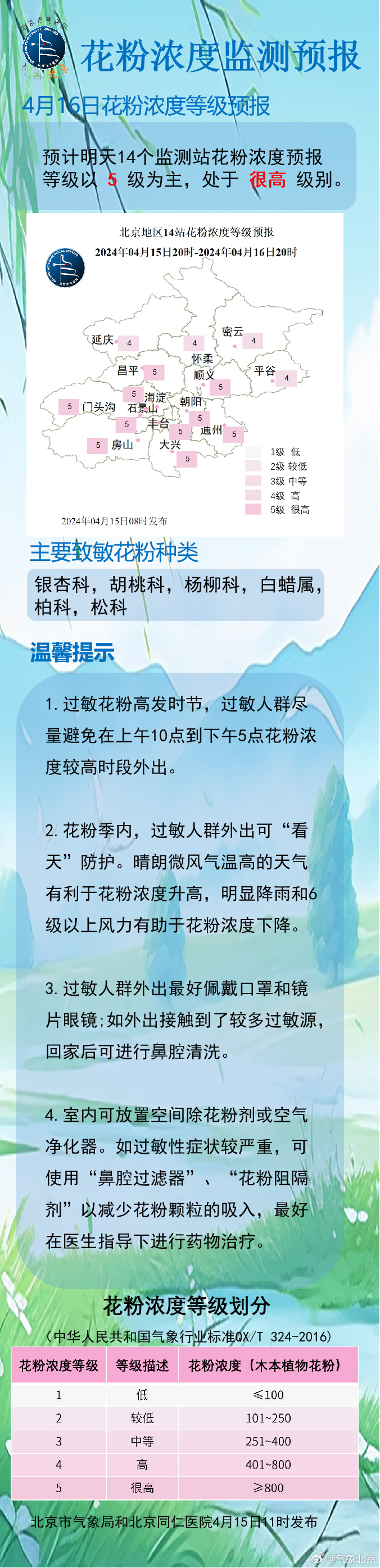 央视网消息:@气象北京 发布花粉实况及花粉浓度预报,昨日(4月14日)北京6站大部花粉浓度等级为4级。目前本市主要致敏花粉种类为银杏科、胡桃科、杨柳科,白蜡属,柏科,松科等。预计4月15日14站花粉浓度以5级为主,为很高级别(>800)。今天有大风沙尘天气,大部分地区花粉浓度为很高级别,敏感人群外出需注意做好健康防护。