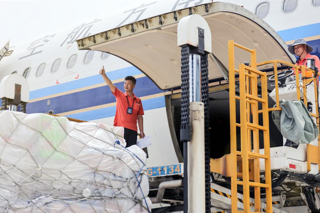 2024年“五一”期间,广州白云机场,南航装卸员侯华伟与同事一起装载航班行李和货物。(南航供图)