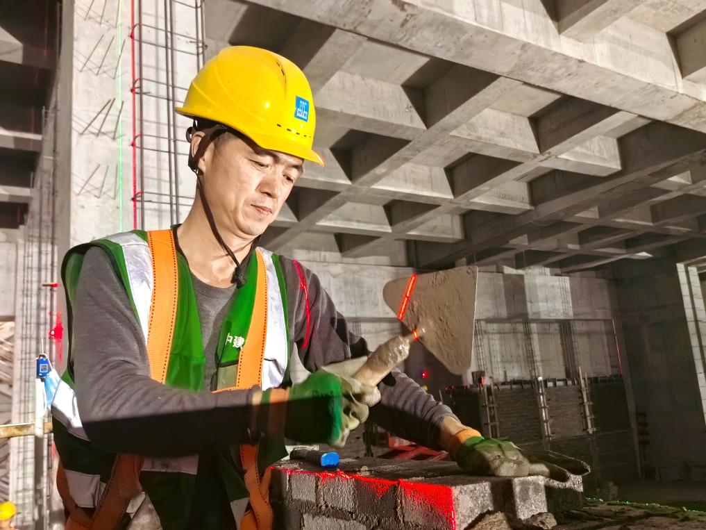 铲灰、抹灰、砌砖、敲实……北京东南高速公路智慧物流港的工地上,中建三局北京公司的砌筑工纪庆生手握灰刀、上下翻飞,动作一气呵成,面前的砖墙交错排列、垒叠起来,已砌到十余米高。
