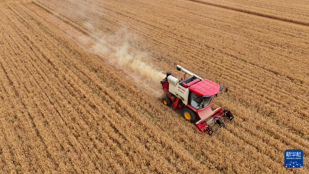 河北省馆陶县柴堡镇农机手驾驶收割机对黑小麦进行收割。新华社记者 赵鸿宇 摄