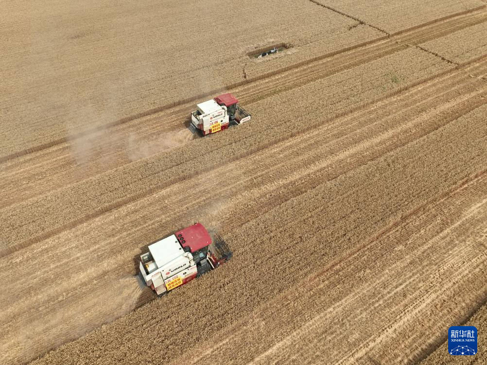 河北省宁晋县黄退三村正在收割的麦田。新华社记者 赵鸿宇 摄