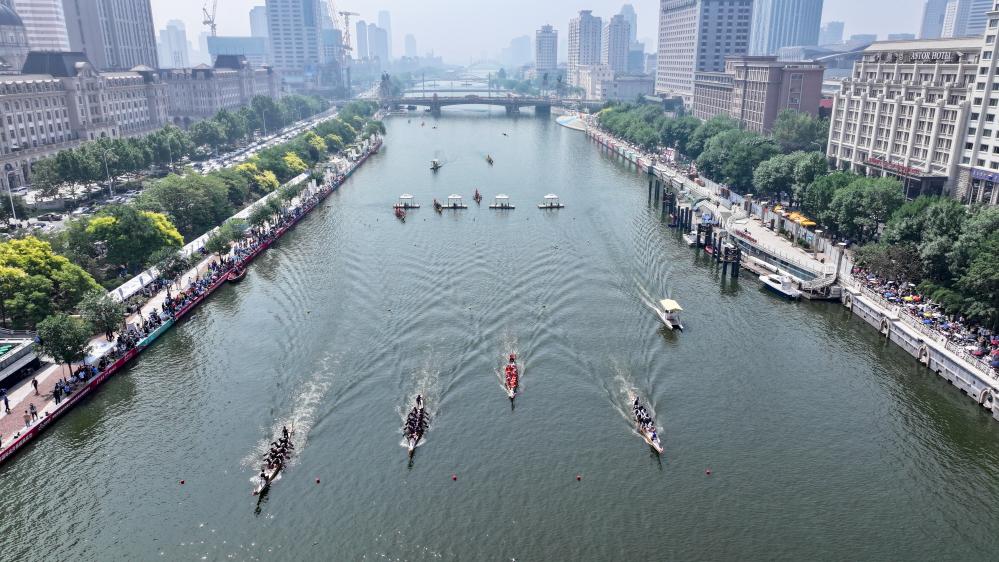 新华社天津6月10日电(记者尹思源)10日上午,2024年“行走大运河”——中国辉煌足迹大运河龙舟系列活动(天津站)、2024天津海河龙舟赛暨外商投资企业运动会龙舟比赛火热开赛。伴随笛声响起,一条条“蛟龙”冲波而出,泛起层层涟漪。站在桥上俯瞰,龙舟竞渡如一道道流星划过,伴着阵阵鼓声,队员们奋楫冲击。