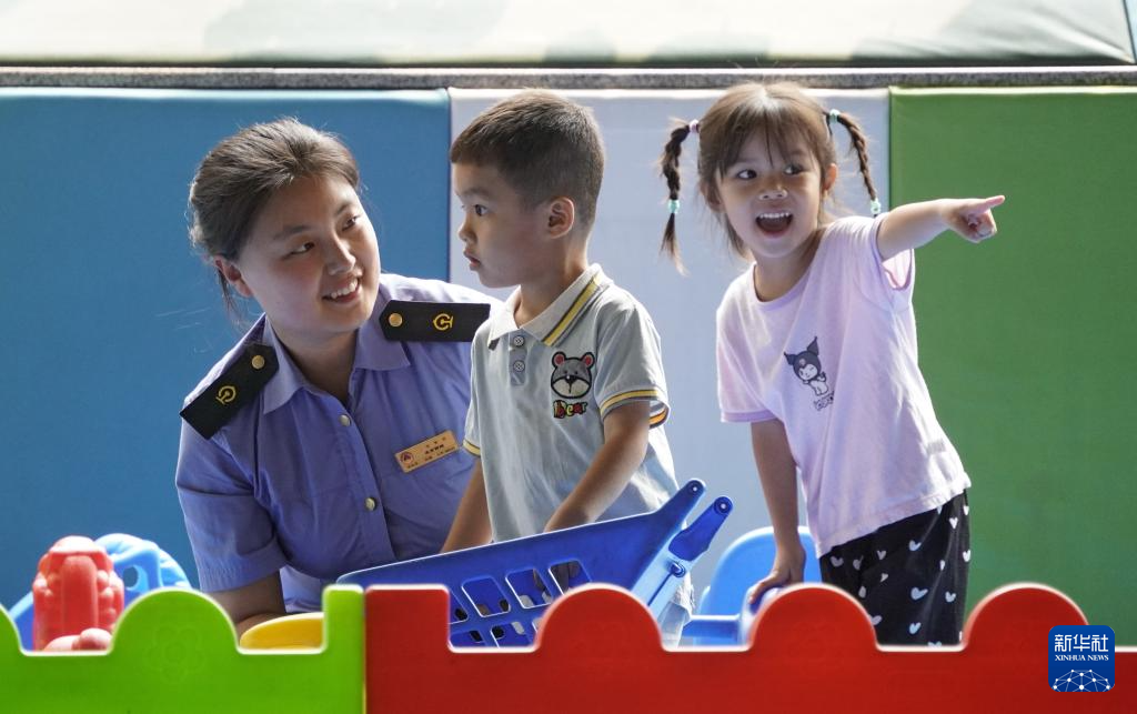 7月4日,北京西站“京铁爱心服务组”工作人员在儿童候车区陪孩子们玩耍。
