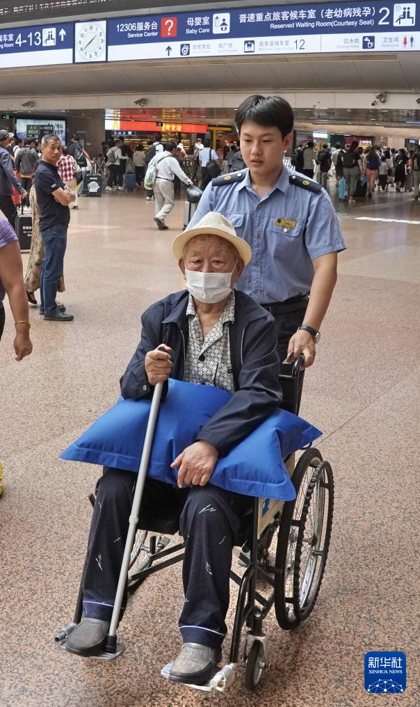 7月4日,北京西站工作人员帮助乘坐轮椅的老年人乘车出行。