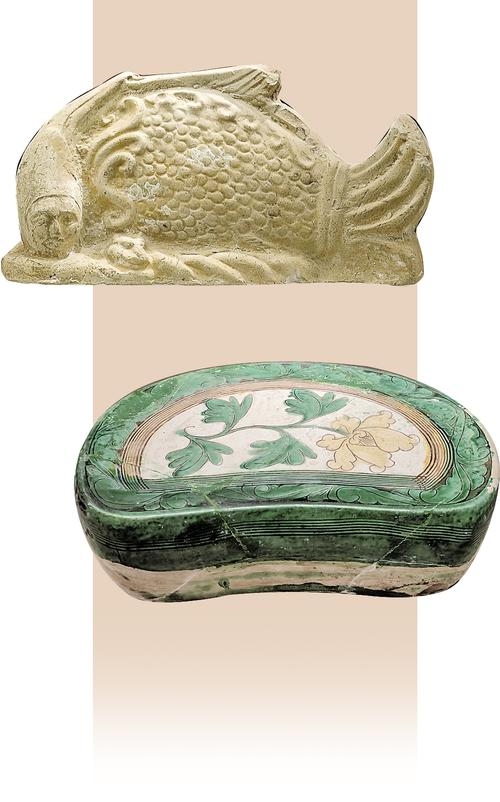 上图:3月20日在冀州博物馆拍摄的卧式人面鱼形陶俑。下图:3月20日在冀州博物馆拍摄的三彩划花牡丹纹腰圆枕。本稿图片均由本报记者史晓多摄