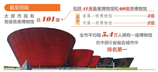 太原市充分发挥文物资源优势,将博物馆作为文物保护利用改革的突破口,倾力建设凸显地方文化特色的“博物馆之城”。截至目前,太原市现有各级各类博物馆达101座,包括41座备案博物馆和60座类博物馆,其中省属一级博物馆3座、市属一级博物馆2座。全市平均每5.4万人拥有一座博物馆,在中部6省省会城市中排名第一,远超全国平均水平。