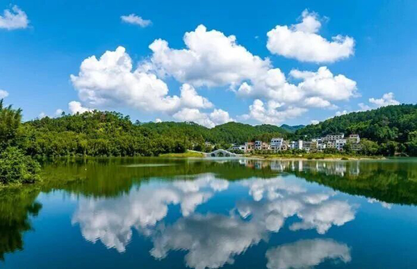 近日,广西梧州市苍梧县京南镇古榄村,蓝天白云与水库、青山、村居交相辉映,构成一幅生态宜居的山水画卷。近年来,苍梧县京南镇严格落实河湖长制,依托地理优势和丰富水域资源,打造以水系、码头景观、滨河绿化及玩水嬉戏为主的滨水景观带。