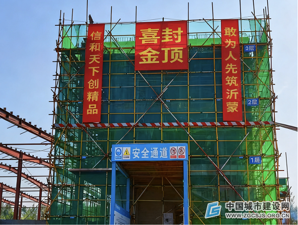 近日,由中建五局山东公司承建的临沂生态城EOD项目继钢结构工程全面启动并进入大面积吊装阶段后,迎来重要建设进展——项目4号办公楼顺利完成主体结构封顶。这一关键节点的达成,标志着项目建设取得了阶段性胜利,为后续工程的顺利推进奠定了坚实基础。