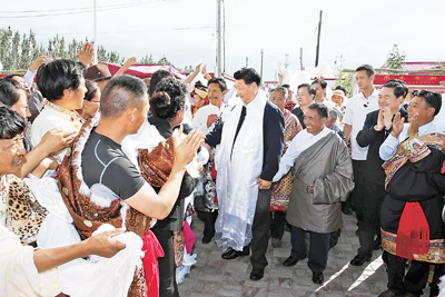 离开盐湖码头,习近平驱车来到格尔木市唐古拉山镇长江源村视察。该村为藏族村,是一个移民定居点。2004年11月,128户407名牧民群众积极响应国家三江源生态保护政策,从400多公里之外、海拔4700米的地方搬迁至格尔木市南郊。习近平一下车,老村支书更尕南杰就迎上前向他敬献哈达,村民向他敬献切玛、青稞酒。习近平在村委会听取该村生态移民搬迁、民族团结创建、基层组织建设等情况介绍,随后视察村容村貌,并到藏族村民申格家中察看住房和生活情况,同一家人亲切交谈。申格从多方面赞扬生态移民政策好,并拿出自家的草原证、医保卡给总书记看。看到乡亲们衣食住行各方面条件比较好,有稳定的收入,普遍参加了基本医疗保险和养老保险,习近平很高兴,对他们说你们的幸福日子还长着呢。习近平指出,保护三江源是党中央确定的大政策,生态移民是落实这项政策的重要措施,一定要组织实施好。习近平强调,我们国家是多民族国家,各民族是一家人,大家要相亲相爱、共同团结进步。临别时,村民们身着鲜艳的藏族服装,扶老携幼,来到村口欢送总书记,他们手挥哈达,不停高喊“扎西德勒”,习近平同乡亲们一一握手,祝他们日子越来越美满。欢乐祥和的动人场景,展现了总书记同藏族同胞心连心的真挚情感。